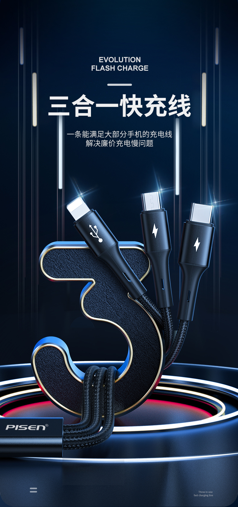 品胜苹果13数据线三合一快充iPhone11充电线器一拖三车载加长适用华为安卓Typec三头多功能闪充平板通用正品